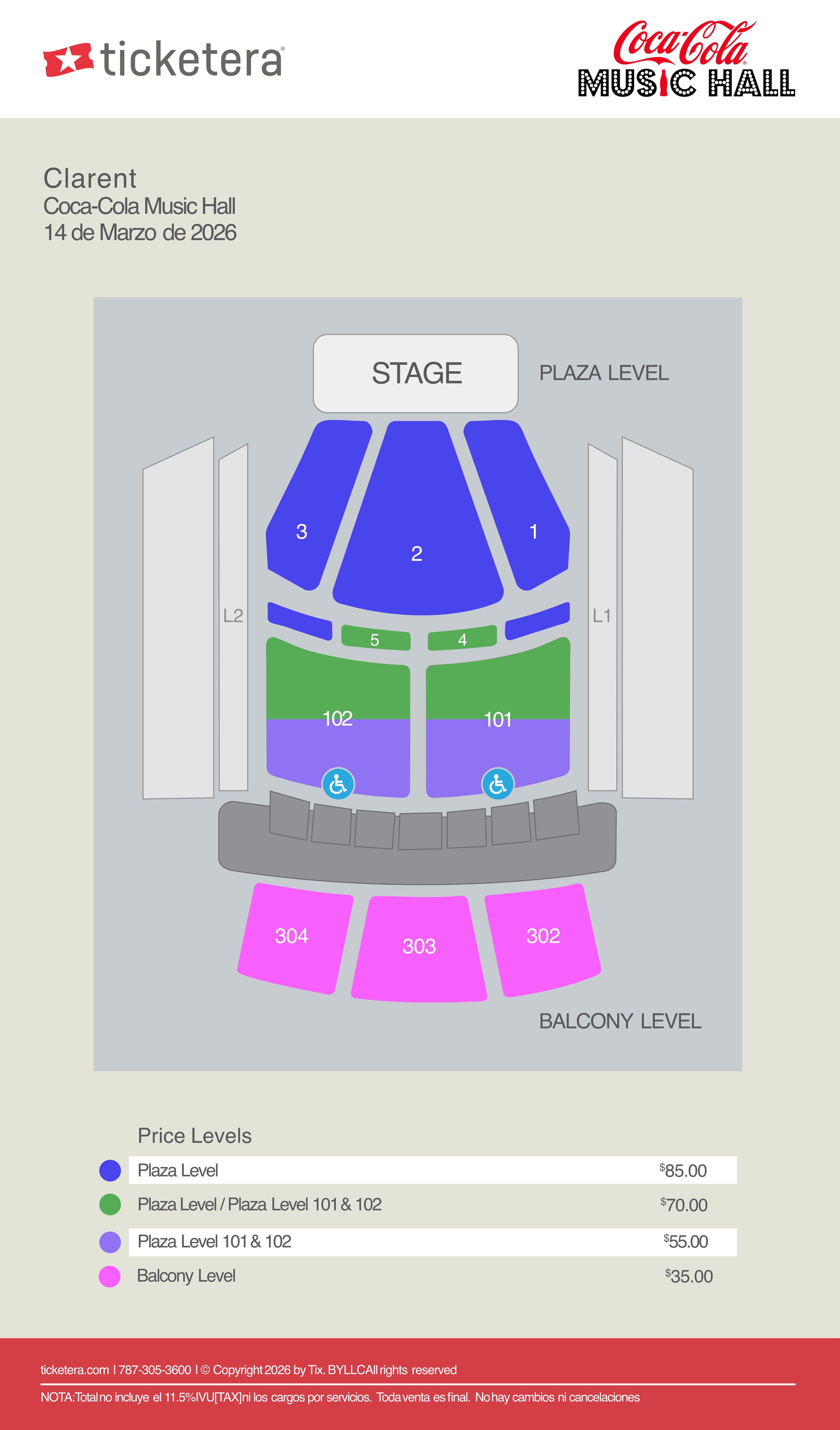 Para asistencia con la compra de boletos en el área ADA, favor de comunicarse con el Coca-Cola Music Hall al 787-425-0900. Al adquirir boletos en esta sección, el comprador acepta presentar una tarjeta de impedido o carné válido el día del evento como requisito de entrada.