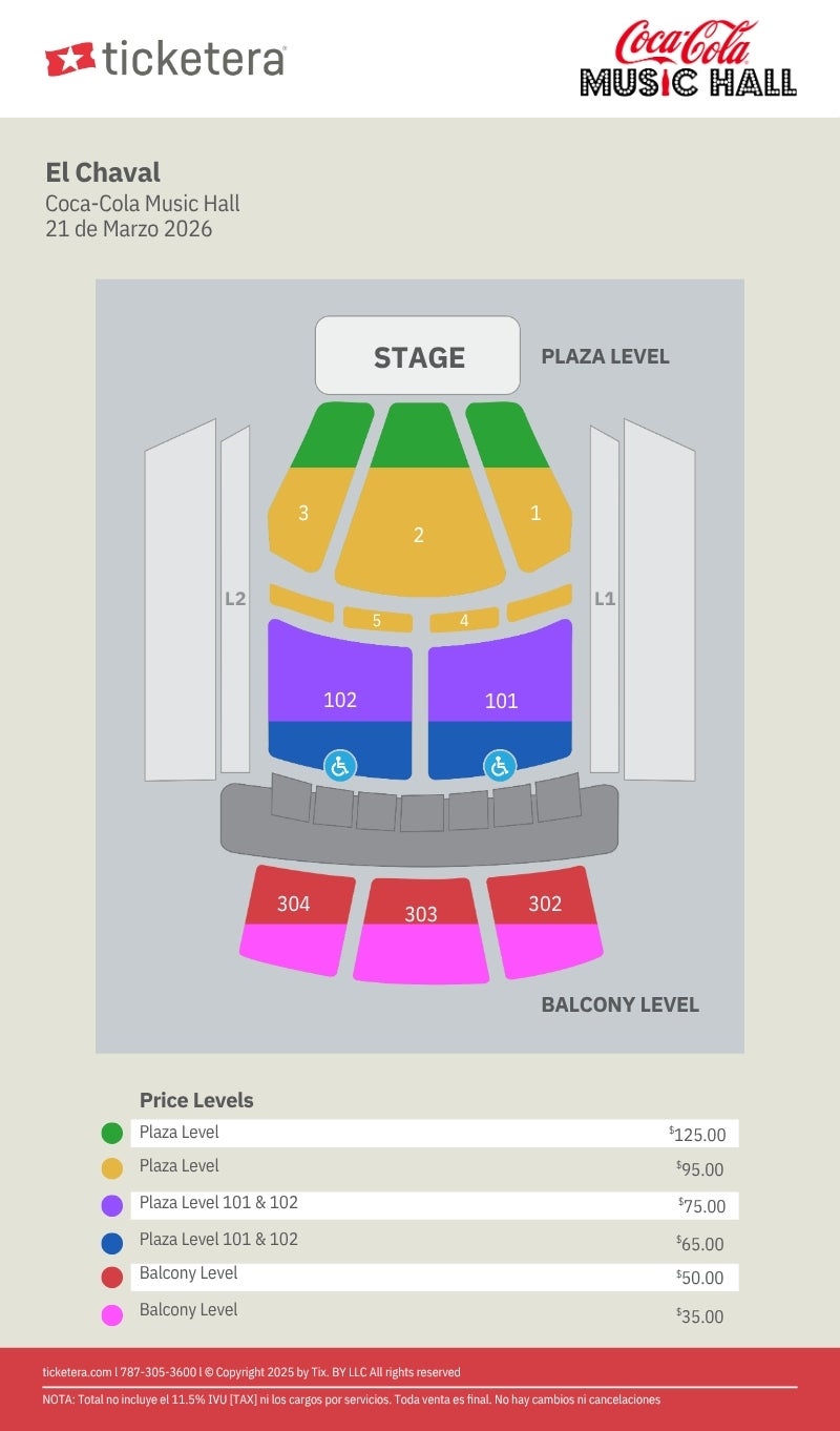 Para asistencia con la compra de boletos en el área ADA, favor de comunicarse con el Coca-Cola Music Hall al 787-425-0900. Al adquirir boletos en esta sección, el comprador acepta presentar una tarjeta de impedido o carné válido el día del evento como requisito de entrada.