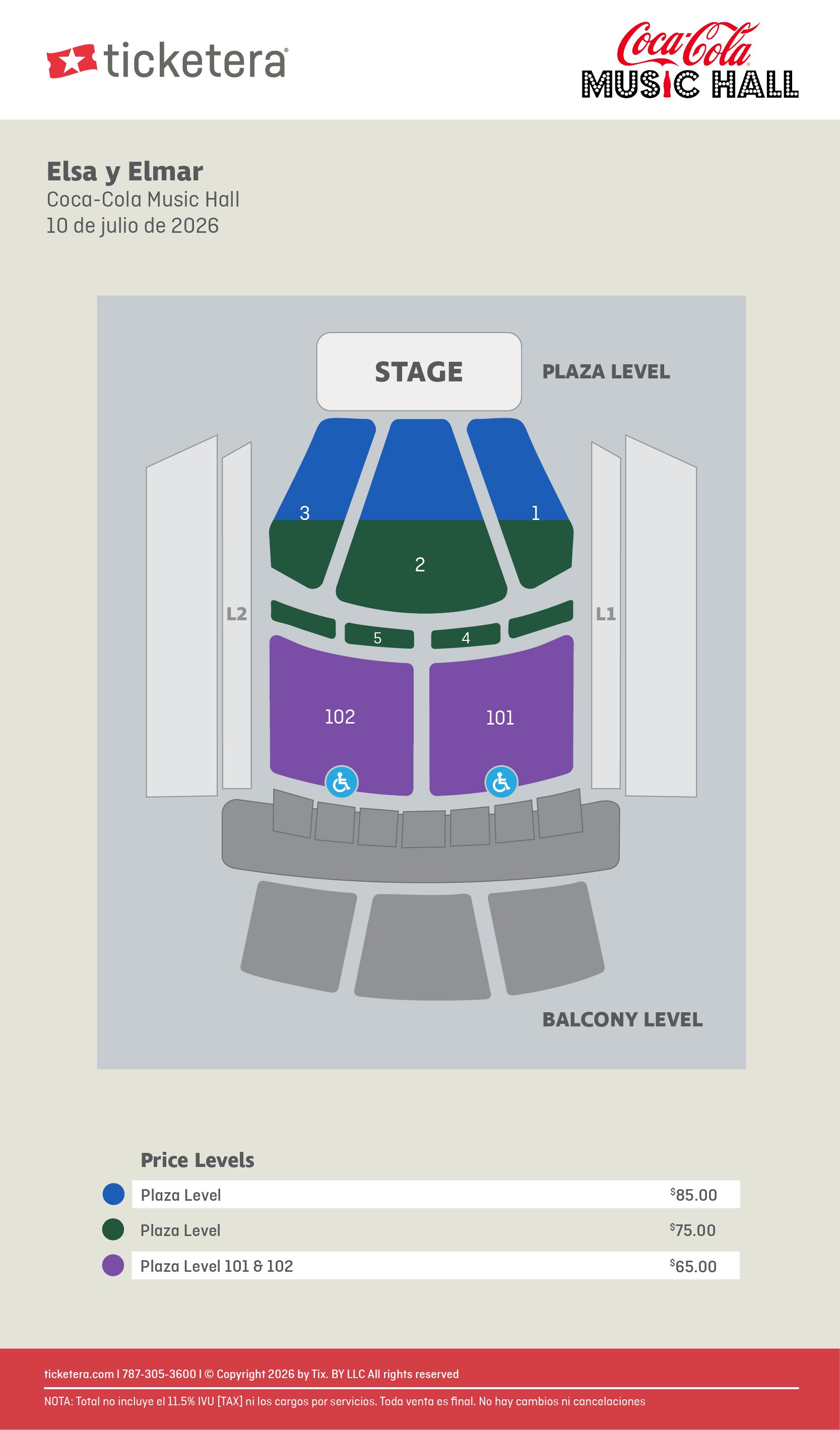 Para asistencia con la compra de boletos en el área ADA, favor de comunicarse con el Coca-Cola Music Hall al 787-425-0900. Al adquirir boletos en esta sección, el comprador acepta presentar una tarjeta de impedido o carné válido el día del evento como requisito de entrada.