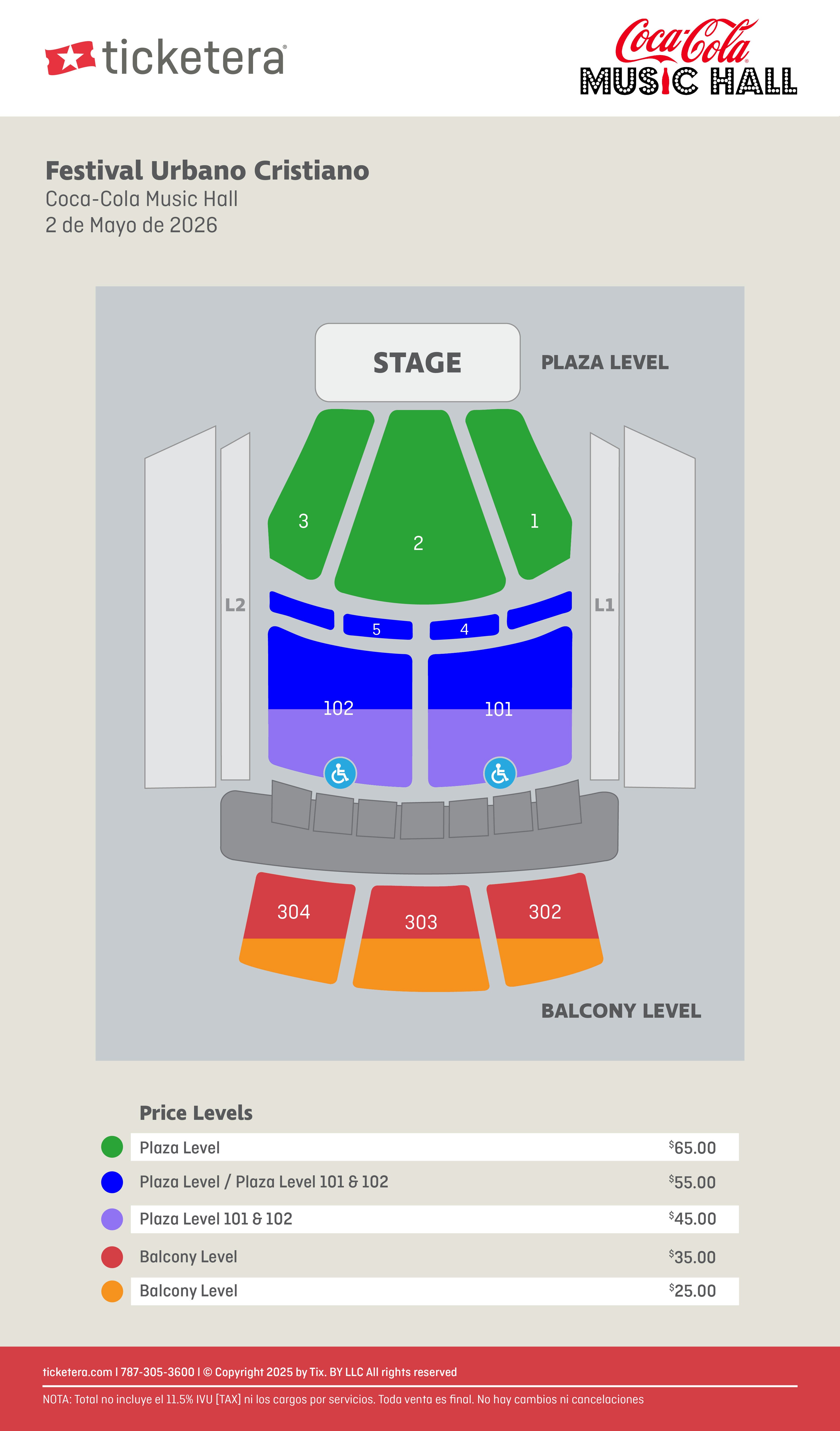 Para asistencia con la compra de boletos en el área ADA, favor de comunicarse con el Coca-Cola Music Hall al 787-425-0900. Al adquirir boletos en esta sección, el comprador acepta presentar una tarjeta de impedido o carné válido el día del evento como requisito de entrada.