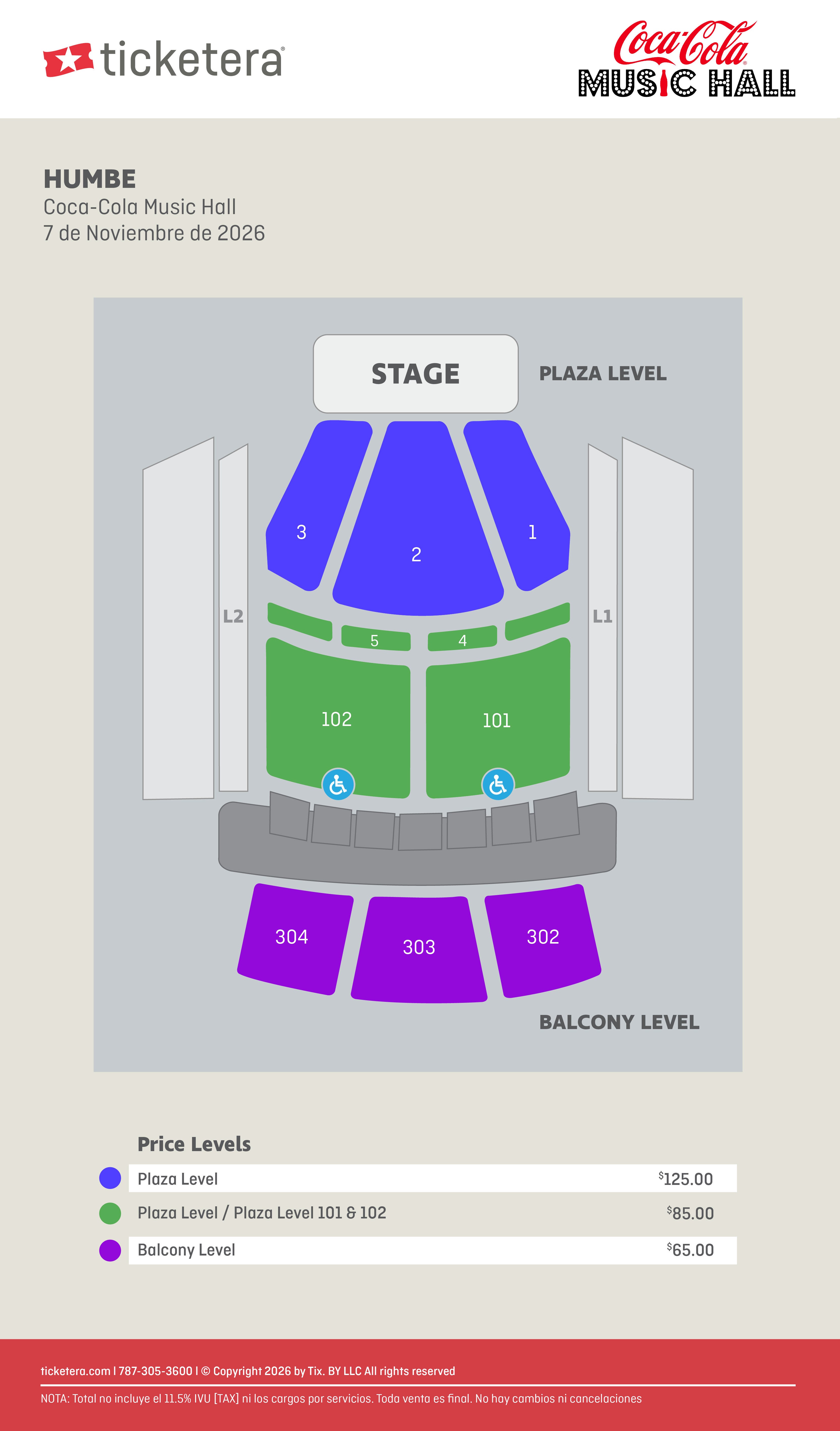Para asistencia con la compra de boletos en el área ADA, favor de comunicarse con el Coca-Cola Music Hall al 787-425-0900. Al adquirir boletos en esta sección, el comprador acepta presentar una tarjeta de impedido o carné válido el día del evento como requisito de entrada.