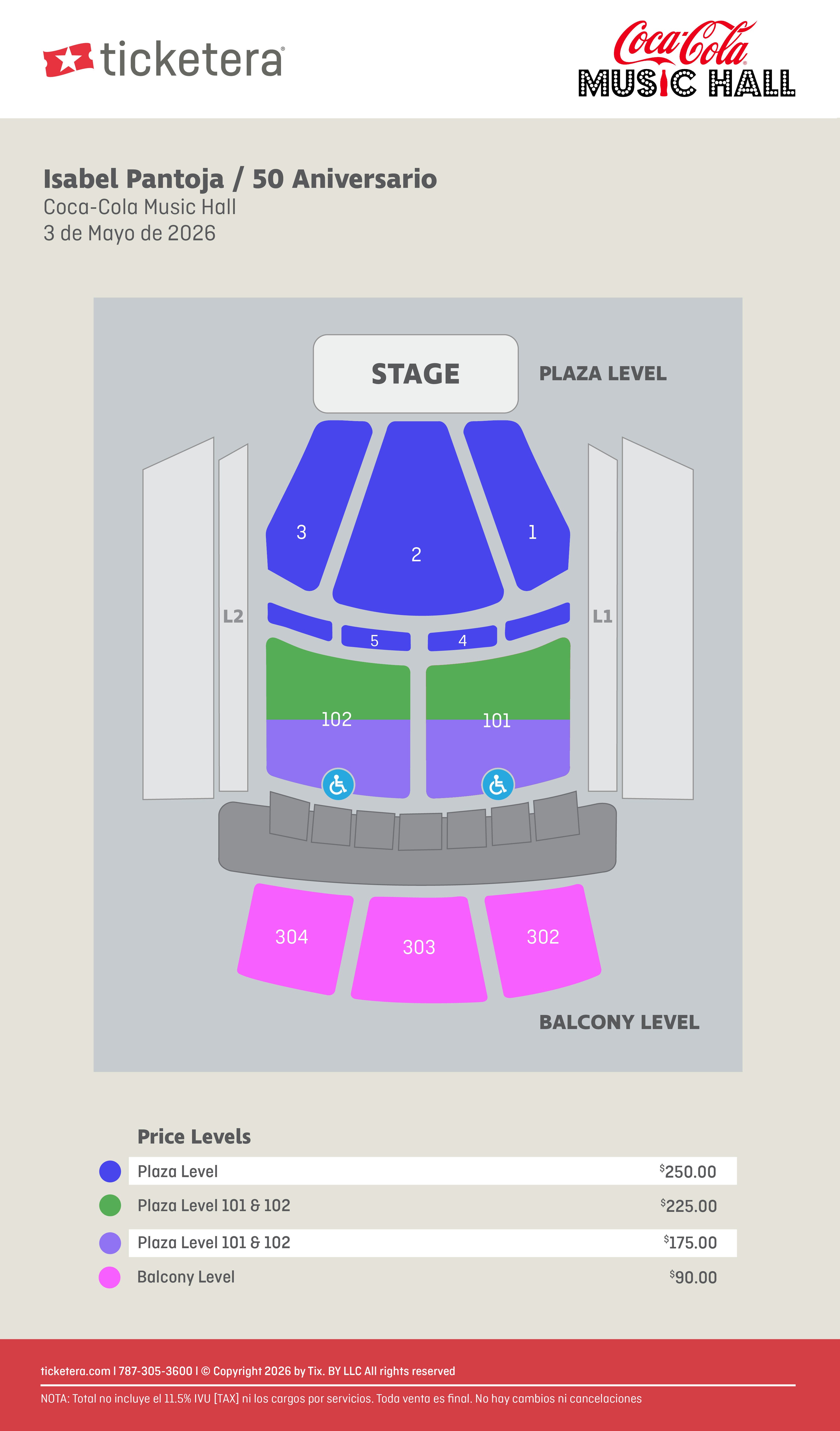 Para asistencia con la compra de boletos en el área ADA, favor de comunicarse con el Coca-Cola Music Hall al 787-425-0900. Al adquirir boletos en esta sección, el comprador acepta presentar una tarjeta de impedido o carné válido el día del evento como requisito de entrada.