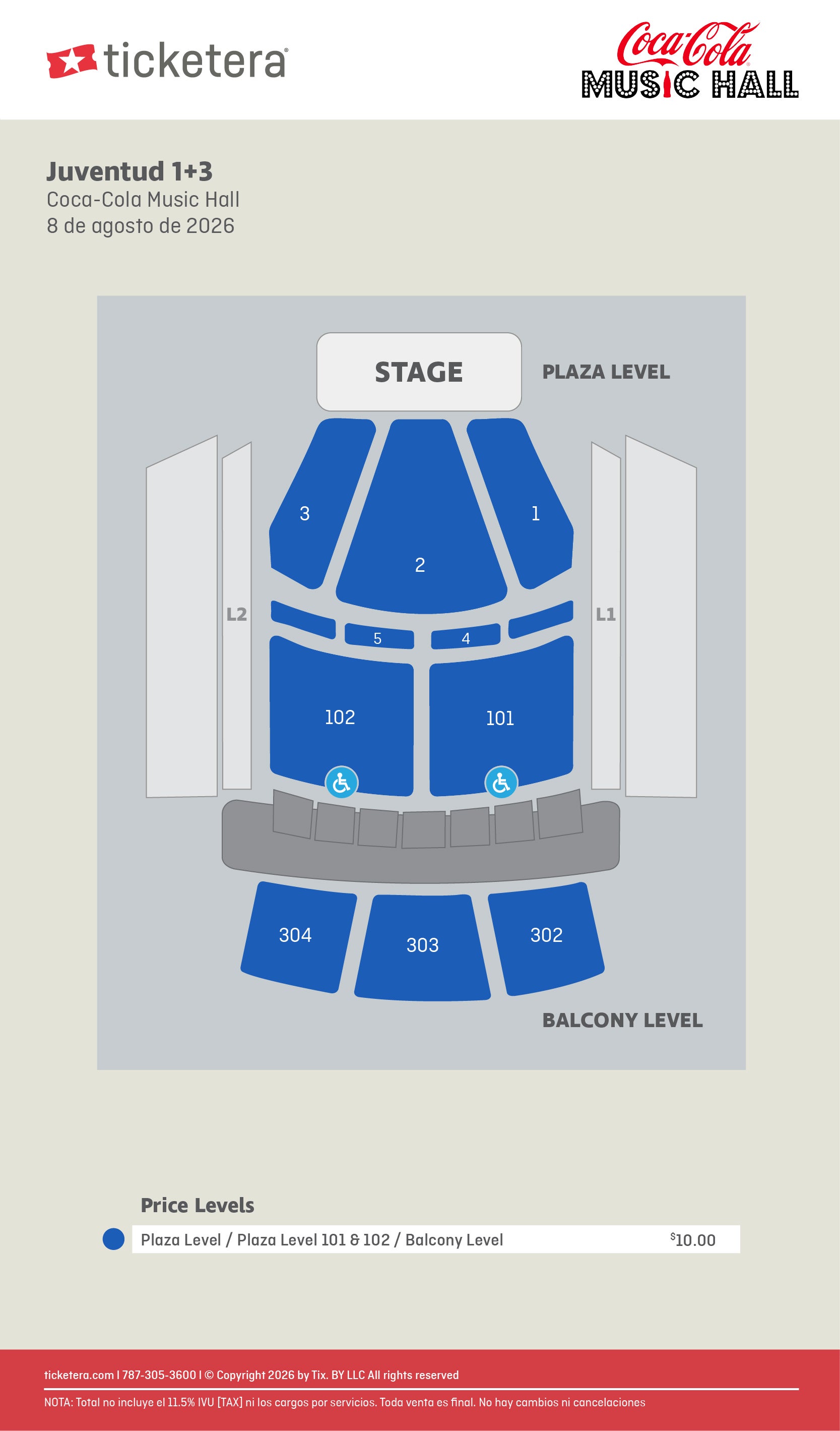 Para asistencia con la compra de boletos en el área ADA, favor de comunicarse con el Coca-Cola Music Hall al 787-425-0900. Al adquirir boletos en esta sección, el comprador acepta presentar una tarjeta de impedido o carné válido el día del evento como requisito de entrada.