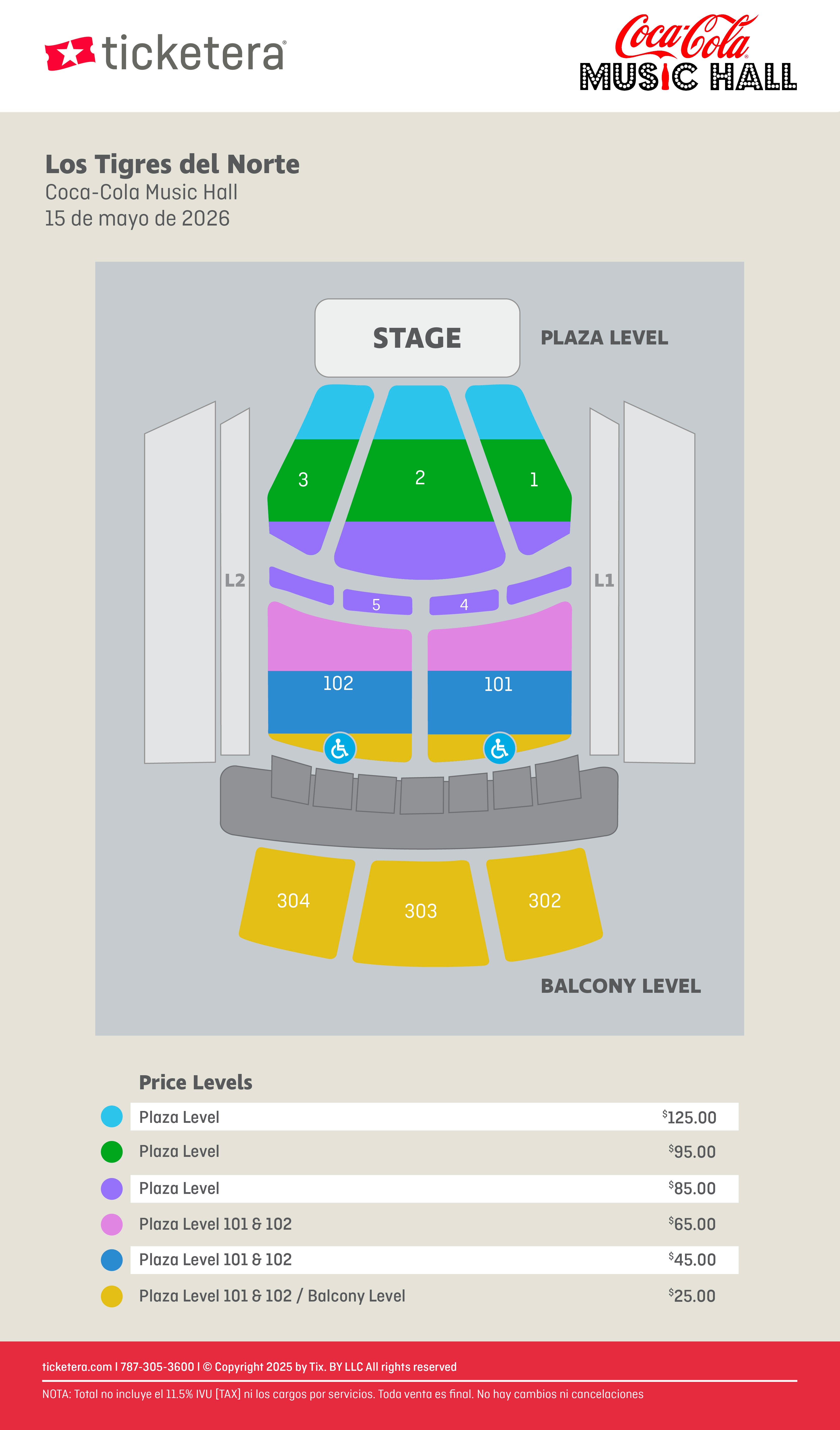 Para asistencia con la compra de boletos en el área ADA, favor de comunicarse con el Coca-Cola Music Hall al 787-425-0900. Al adquirir boletos en esta sección, el comprador acepta presentar una tarjeta de impedido o carné válido el día del evento como requisito de entrada.