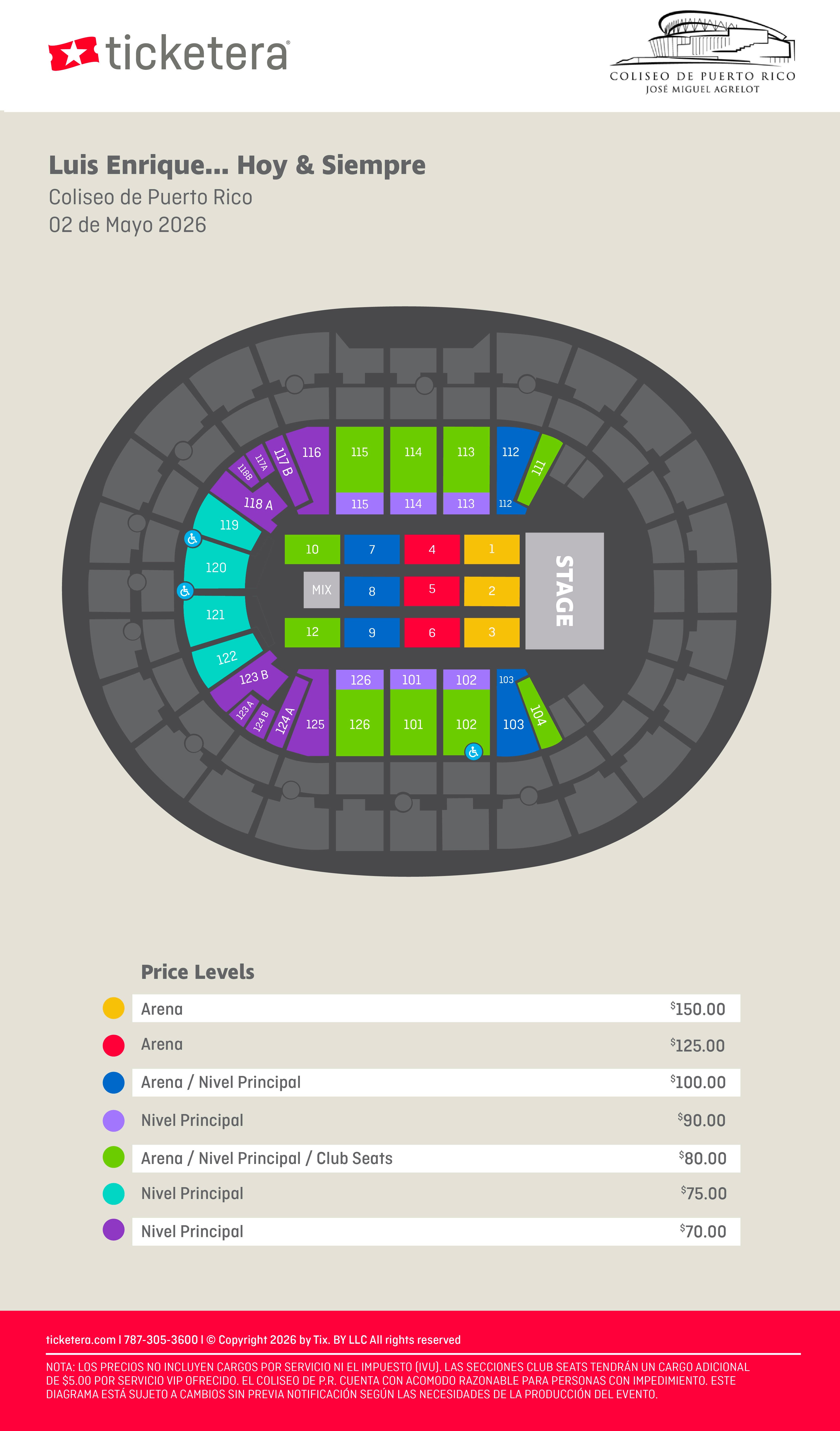 Al adquirir boletos en una sección ADA (WH), el comprador acepta presentar una tarjeta de impedido o carné válido el día del evento como requisito de entrada.