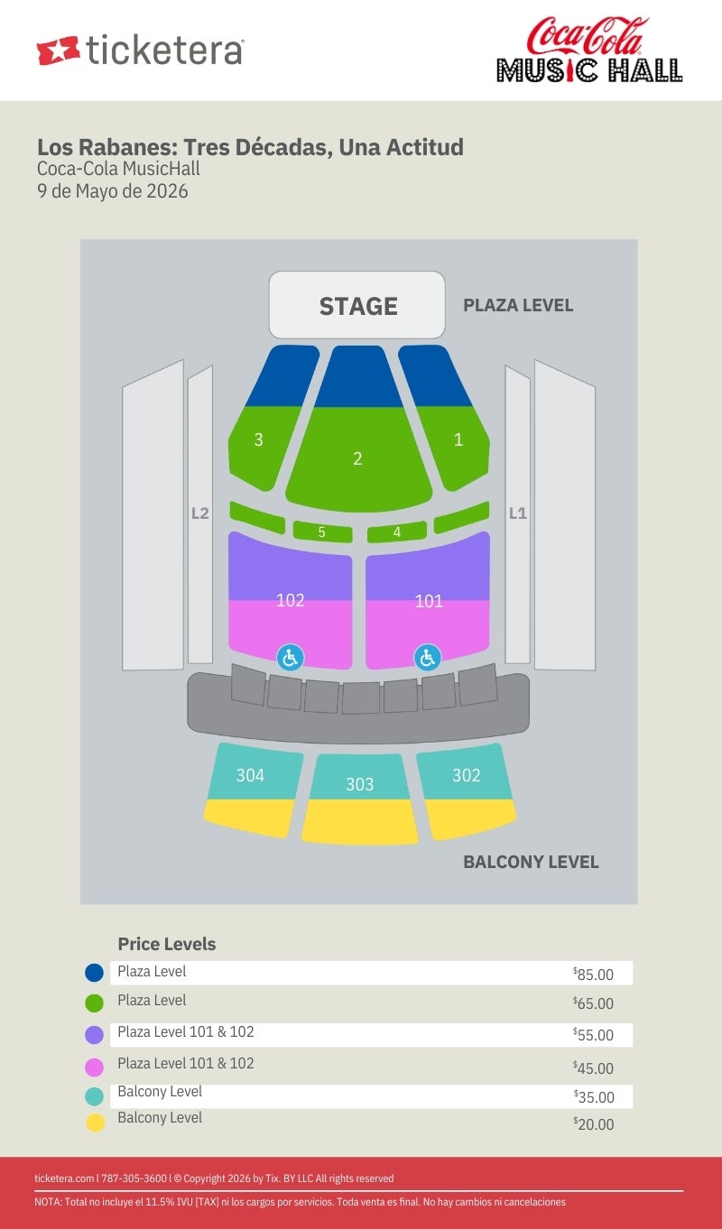 Para asistencia con la compra de boletos en el área ADA, favor de comunicarse con el Coca-Cola Music Hall al 787-425-0900. Al adquirir boletos en esta sección, el comprador acepta presentar una tarjeta de impedido o carné válido el día del evento como requisito de entrada.